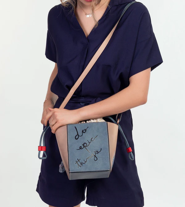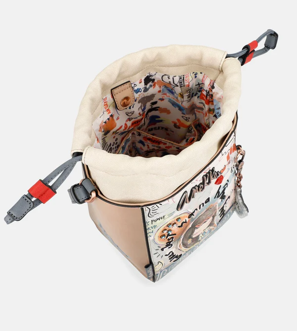 Esta bolsa tiracolo estampada para mulher tem uma original forma de saco , graças ao seu fecho na parte superior. Seu design combina tons de azul, marrom e cru com a estampa da coleção, toques de vermelho, bordados e inúmeros detalhes.